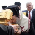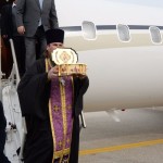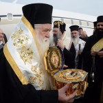 Στον Αερολιμένα του Αράξου τα Λείψανα υπεδέχθησαν ο Σεβασμιώτατος Μητροπολίτης Καλαβρύτων και Αιγιαλείας κ. Αμβρόσιος, ο Σεβασμιώτατος Μητροπολίτης Πατρών κ.κ. Χρυσόστομος και ο Θεοφιλέστατος Επίσκοπος Κερνίτσης κ. Χρύσανθος.
