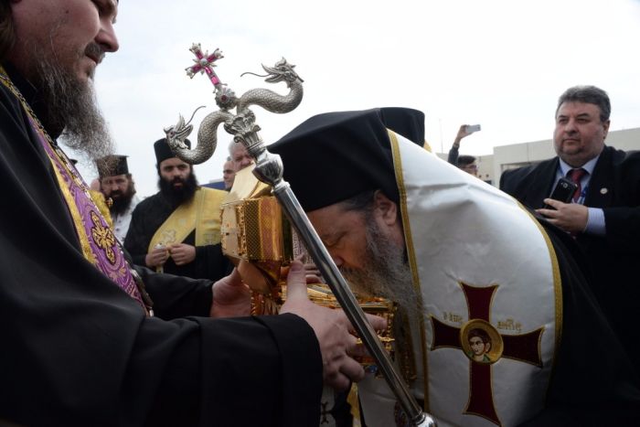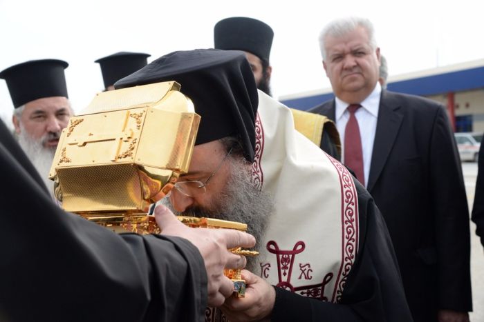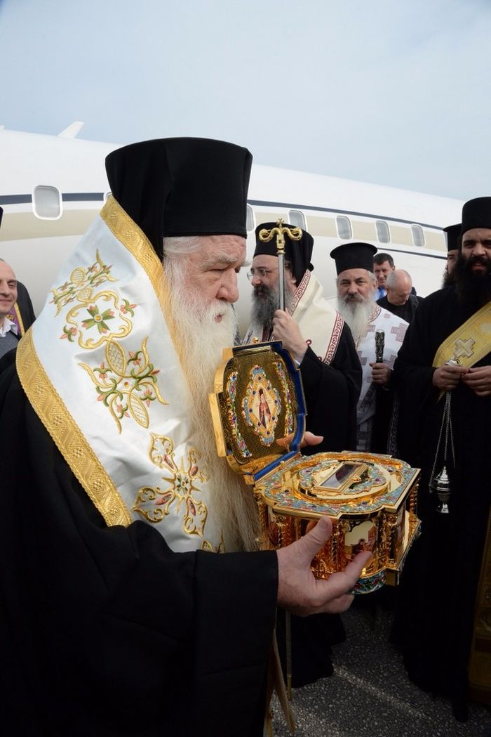 Στον Αερολιμένα του Αράξου τα Λείψανα υπεδέχθησαν ο Σεβασμιώτατος Μητροπολίτης Καλαβρύτων και Αιγιαλείας κ. Αμβρόσιος, ο Σεβασμιώτατος Μητροπολίτης Πατρών κ.κ. Χρυσόστομος και ο Θεοφιλέστατος Επίσκοπος Κερνίτσης κ. Χρύσανθος.