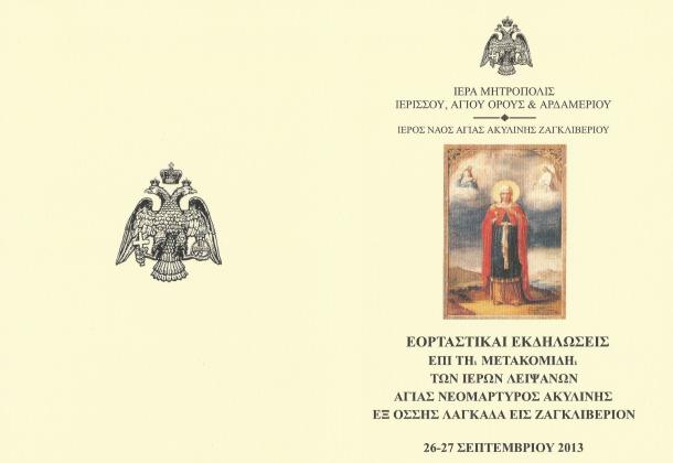 α) Ώρα 17:30 Υποδοχή των Ιερών Λειψάνων της Αγίας στην κεντρική πλατεία Ζαγκλιβερίου και Λιτανεία τους στον Ιερό Ναό.