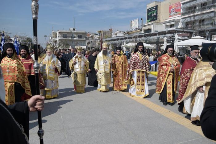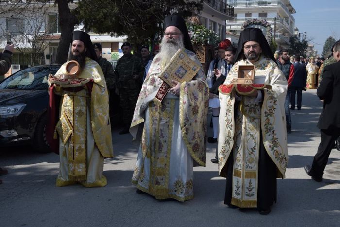 Ανήμερα της εορτής το πρωί της Θείας Λειτουργίας προέστη και μίλησε καταλλήλως ο Σεβασμιώτατος Μητροπολίτης Βέροιας κ. Παντελεήμων συλλειτουργούντων των Σεβασμιωτάτων Μητροπολιτών Ελασσώνος κ. Χαρίτωνος και Διδυμοτείχου κ. Δαμασκηνού. Μετά την Θεία Λειτουργία λιτανεύθηκαν οι εικόνες των Αγίων Θεοδώρων και της Παναγίας της Σιναΐτιδος και στην Κεντρική Πλατεία της πόλης ευλογήθηκαν οι άρτοι και προσεφώνησε τους επισήμους και τους πιστούς ο οικείος Αρχιερεύς.