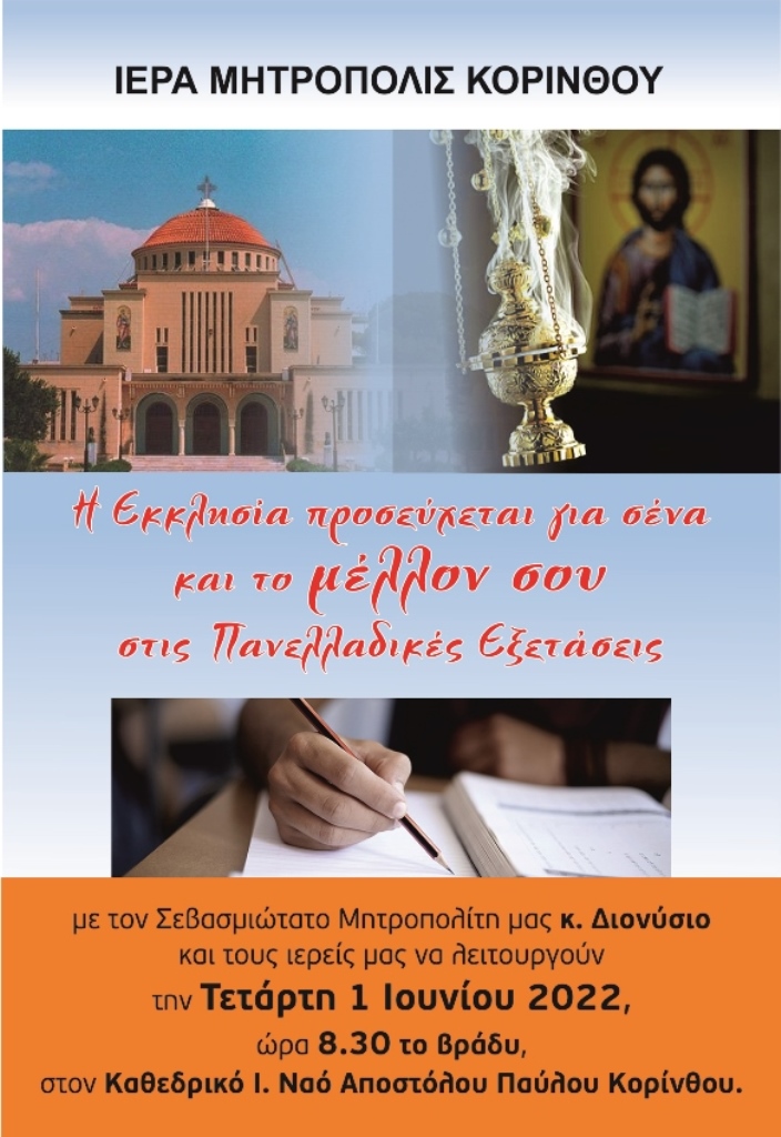 Η Μητρόπολη Κορίνθου προγραμματίζει βραδυνη Θεία Λειτουργία για τους μαθητές, την Τετάρτη, 1 Ιουνίου 2022, 20:30 μ.μ., στον Ι. Καθεδρικό Ναό της Μητροπόλεως του Αποστόλου Παύλου.