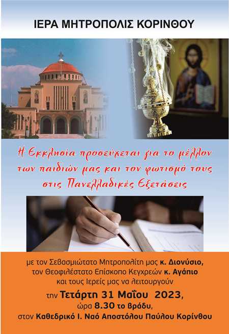 Βραδυνή Θεία Λειτουργία θα πραγματοποιηθεί το βράδυ της Τετάρτης, 31 Μαΐου 2023, στη Μητρόπολη Κορίνθου, για τους υποψηφίους των Πανελλαδικών Εξετάσεων.