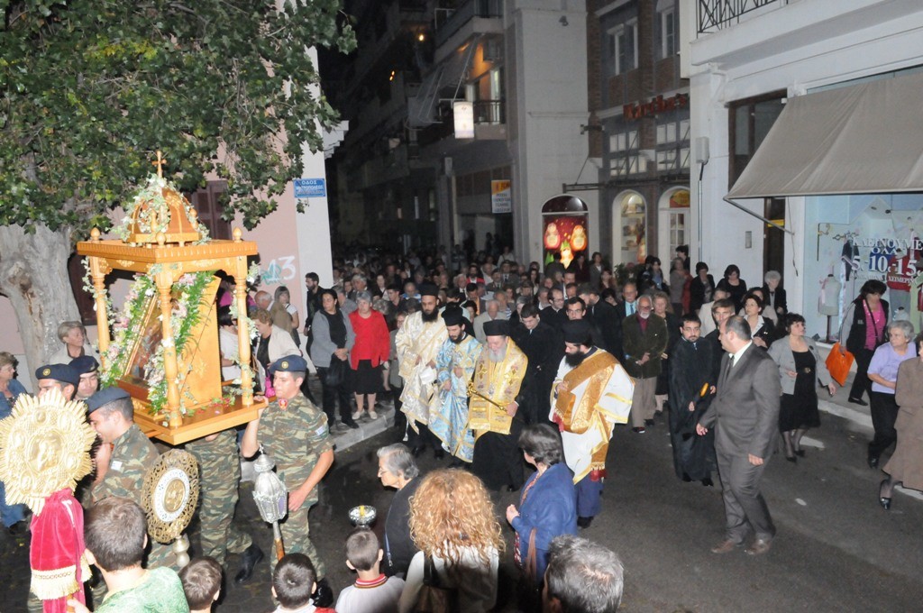 Στη συνέχεια η πομπή κατευθύνθηκε στον Ναό του Αγίου Δημητρίου, όπου εψάλη η Ιερά Παράκληση της Θεοτόκου, χοροστατούντος του κ. Χρυσοστόμου.