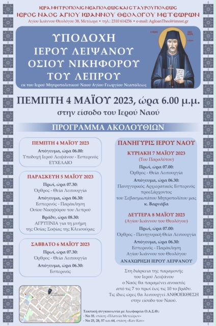 Ο Ι. Ναός Αγίου Ιωάννου του Θεολόγου της Μητροπόλεως Νεαπόλεως και Σταυρουπόλεως, υποδέχεται Ι. Λείψανο του Οσίου Νικηφόρου του λεπρού, σύμφωνα με το ακόλουθο Πρόγραμμα: