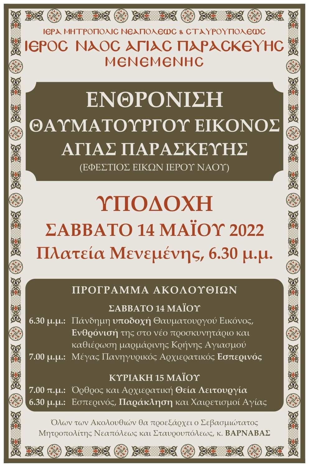 Το Σάββατο, 14 Μαΐου 2022, η Μητρόπολη Νεαπόλεως θα υποδεχθεί με τιμές τη θαυματουργό εικόνα της Αγίας Παρασκευής, στην πλατεία Μενεμένης, στις 18:30 μ.μ.
