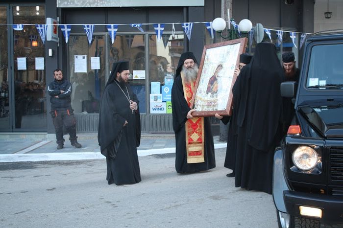 Ο Σεβασμιώτατος ευχαρίστησε την Ιερά Επιστασία του Αγίου Όρους, τον Ηγούμενο της Ιεράς Μονής Κουτλουμουσίου Γέροντα Χριστόδουλο, οι οποίοι έδωσαν την άδεια και την ευλογία για την έξοδο της Ιεράς Εικόνος από το Άγιο Όρος. Επίσης, ο Σεβασμιώτατος αναφέρθηκε στο πρόσωπο της Παναγίας μας, στις αρετές που πηγάζουν από αυτή και πόσο ανάγκη έχει η κοινωνία μας και ο κάθε πιστός ξεχωριστά την μεσιτεία και προστασία της. Ακολούθησε αντιφώνηση του π. Φιλοθέου, ο οποίος, με δύο αδερφούς της Μονής, μετέφεραν την Ιερά Εικόνα στην Ενορία.