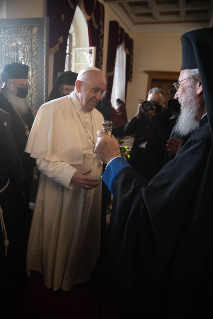 Στις 8.30 π.μ. τής Παρασκευής 3 Δεκεμβρίου, αφίχθηκε στην Ιερά Αρχιεπισκοπή Κύπρου ο πάπας Φραγκίσκος, ο 266ος Πάπας τής Ρωμαιοκαθολικής Εκκλησίας. Τον πάπα Φραγκίσκο υποδέχθηκε ο Μακαριώτατος Αρχιεπίσκοπος Κύπρου κ.κ. Χρυσόστομος Β΄. Στη συνέχεια, ο πάπας χαιρέτισε τα παρευρισκόμενα μέλη τής Ιεράς Συνόδου τής Εκκλησίας Κύπρου. Ακολούθησε κατ’ ιδίαν συνάντηση τού Αρχιεπισκόπου Κύπρου με τον πάπα στο αρχιεπισκοπικό γραφείο για 20 περίπου λεπτά.