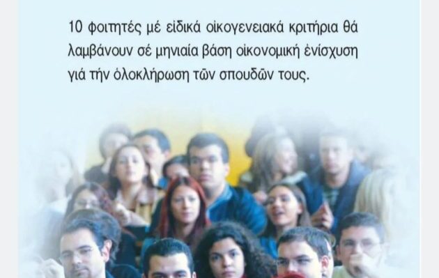 Χορηγούνται οκτώ (8) υποτροφίες σε νεοεισαχθέντες κατά το ακαδημαϊκό έτος 2025-2026 προπτυχιακούς φοιτητές/τριες με οικονομικές δυσκολίες, που φοιτούν σε Ελληνικά ιδρύματα Τριτοβάθμιας Εκπαίδευσης ( πλην των Θεολογικών Σχολών του Εθνικού και Καποδιστριακού Πανεπιστημίου Αθηνών, του Αριστοτελείου Πανεπιστημίου Θεσσαλονίκης και των Ανωτάτων Εκκλησιαστικών Ακαδημιών Αθηνών και Θεσσαλονίκης). Η κάθε υποτροφία ισοδυναμεί με το ποσό των 2.400 ευρώ και σκοπό έχει την κάλυψη διαφόρων οικονομικών αναγκών των νεοσειχθάντων φοιτητών (ενοίκια, σίτιση κλπ).