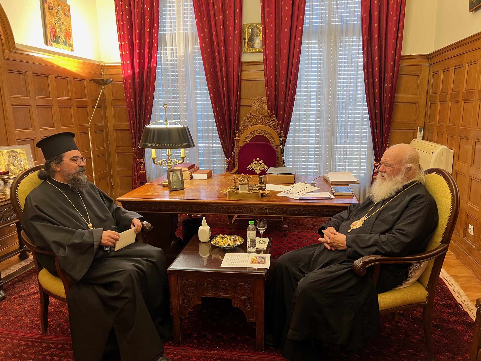 Στην είσοδο της Αρχιεπισκοπής έγινε δεκτός από τον Πρωτοσύγκελλο της Αρχιεπισκοπής Αρχιμανδρίτη Βαρνάβα Θεοχάρη.