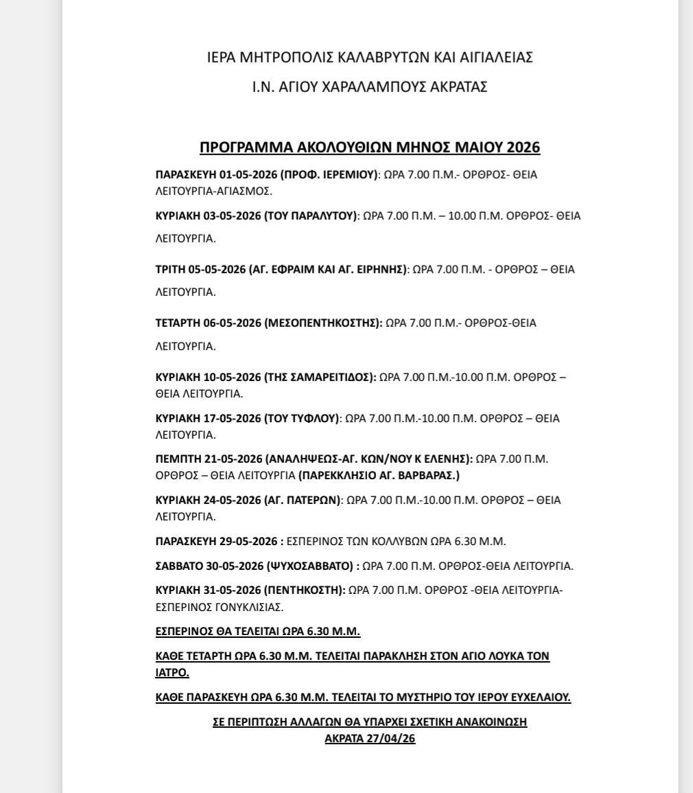 Ναός Αγίου Χαραλάμπους Ακράτας: Πρόγραμμα Ιερών Ακολουθιών Μαΐου Uncategorized, ΕΛΛΑΔΑ, ΜΗΤΡΟΠΟΛΕΙΣ 27.04.2026 | 18:21