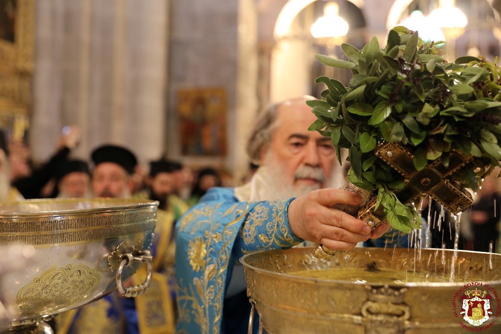 Διά τὴν ἑορτὴν αὐτὴν κατῆλθεν ἡ Ἁγιοταφιτική Ἀδελφότης διά τῶν βαθμίδων τοῦ Ναοῦ τοῦ Ἁγίου Ἰακώβου τοῦ Ἀδελφοθέου εἰς τὸ Καθολικὸν τοῦ Πανιέρου Ναοῦ τῆς Ἀναστάσεως ὑπὸ τὴν αἰγίδα τοῦ Μακαριωτάτου Πατρός ἡμῶν καί Πατριάρχου Ἱεροσολύμων κ.κ. Θεοφίλου, ὁ Ὁποῖος ἐτέλεσε τὸν Μέγαν Ἁγιασμὸν, ὡς ὁρίζει ἡ τάξις τῆς Ἐκκλησίας τῆς 6ης Ἰανουαρίου. Ὁ Μακαριώτατος ἡγίασε τὸ ὕδωρ βυθίζων τὸν Σταυρὸν καί ψάλλων τρὶς τὸ «ἐν Ἰορδάνῃ βαπτιζομένου Σου, Κύριε» καὶ τὸ «ἐπεφάνης σήμερον τῇ οἰκουμένῃ καί τό φῶς Σου Κύριε ἐσημειώθη ἐφ’ ἡμᾶς» καὶ ἡγίασε τοὺς Ἀρχιερεῖς καὶ τοὺς Ἱερεῖς καὶ τὸν πιστὸν λαόν.