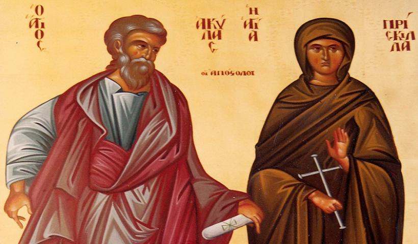 Οι άγιοι Ακύλας και Πρίσκιλλα ήταν ένα ζευγάρι Ιουδαίων που κατοικούσαν στην Κόρινθο και εξασκούσαν το επάγγελμα του σκηνοποιού. Ήσαν δε άνθρωποι ενάρετοι και ευσεβείς. Όταν ο απόστολος Παύλος, επισκέφθηκε την Κόρινθο, για να διδάξει την ορθόδοξη πίστη, οι άγιοι Ακύλας και Πρίσκιλλα του προσέφεραν θερμή φιλοξενία καθώς είχαν εντυπωσιαστεί πάρα πολύ με το κήρυγμά του. Τόσο πολύ τούς άγγιξε ο φλογερός και σωτήριος λόγος του απόστολου, ώστε αφού κατηχήθηκαν και βαπτίσθηκαν από αυτόν, αποφάσισαν να τον ακολουθήσουν στις περιοδείες του ως βοηθοί του. O απόστολος εντυπωσιάσθηκε τόσο από τις αρετές και τη χριστιανική τους δράση ώστε τούς μνημονεύει στις επιστολές του γράφοντας ότι για τις προσφερθείσες υπηρεσίες τους και το θάρρος είναι ευγνώμων όχι μόνον εκείνος, αλλά και όλες οι εκκλησίες των εθνών. Αργότερα οι άγιοι Ακύλας και Πρίσκιλλα συνελήφθησαν από τους διώκτες του χριστιανισμού, οι οποίοι αποκεφάλισαν τους αγίους χαρίζοντάς τους μαζί με τον τίτλο των Αποστόλων και τον τίτλο των Μαρτύρων.