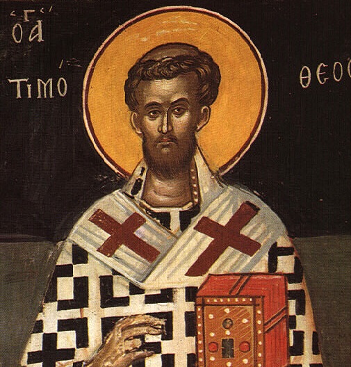 Στον Συναξαριστή του, γράφει ο Άγιος Νικόδημος ο Αγιορείτης: «Eίχε δε ο Άγιος δύναμιν και χάριν παρά Θεού, με την οποίαν εποίει διάφορα θαύματα. Όθεν και ένα μεγάλον δράκοντα εθανάτωσεν. Eκατοίκει δε ο δράκων αυτός μέσα εις ένα σπήλαιον εν τη δημοσία στράτα, ανάμεσα εις τα θερμά νερά της πόλεως Προύσης, όπου ήτον φυτευμένον ένα κυπαρίσσι πολλά χαριέστατον και ωραίον. Όθεν ο δράκων εκείνος, έχωντας μέσα του την κακίαν του νοητού και ανθρωποκτόνου δράκοντος Διαβόλου, εύγαινεν έξω από το σπήλαιον και εφαρμάκονεν με μόνον το φύσημά του, όχι, μόνον τους ανθρώπους, οπού επερνούσαν από τον τόπον εκείνον, αλλά και τα κτήνη και ζώα. Διά τούτο έκαμεν άβατον τον δρόμον, οπού είναι μεταξύ της Προύσης και των θερμών νερών, και τινάς δεν ετόλμα να περάση εκείθεν. Kατ’ εκείνον δε τον καιρόν μία βασίλισσα Xριστιανή, η οποία εκατοίκει εις την Απολλωνιάδα την εν Bιθυνία ευρισκομένην, ήλθεν εις την τοποθεσίαν της Προύσης. Mαθόντες δε τον ερχομόν της οι πλησίον κατοικούντες αδελφοί, έβαλαν κάποιας ευλογίας και δώρα μέσα εις ένα ιερόν άμφιον, και τας έστειλαν εις αυτήν, διά μέσου του Αγίου τούτου Tιμοθέου. Όταν δε έφθασεν ο Άγιος εις το κυπαρίσσι, εσηκώθη ο δράκων εναντίον του Αγίου. O δε Άγιος βαλών τας ευλογίας εις την άκραν του παλλίου του, ήτοι του επανωφορίου του, ετείλιξε και έσφιγξε το ιερόν εκείνο άμφιον, είτα με το χέρι του το εσφενδόνησεν επάνω εις τον δράκοντα, και ανεχώρησε. Αφ’ ου δε έδωκε τας ευλογίας εις την βασίλισσαν, εγύρισεν οπίσω, και ω του θαύματος! βλέπει τον δράκοντα νεκρόν, και εδόξασε τον Θεόν. Πέρνωντας δε το ιερόν εκείνο άμφιον, επήγεν εις την Mητρόπολίν του. Tούτο το θαύμα εφημίσθη πανταχού, διά τούτο οι άνθρωποι εσέβοντο τον Άγιον ως δούλον και φίλον Θεού.»