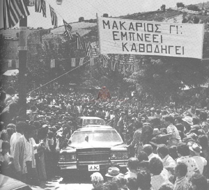 Την 15ην Ιουλίου του 1974 το στρατιωτικό καθεστώς των Αθηνών διενήργησε πραξικόπημα για την ανατροπή του Μακαρίου. Ο Μακαριώτατος, διασωθείς ως εκ θαύματος, αναχώρησε την επομένη, μέσω Μάλτας, στη Βρετανία και από εκεί στις Ηνωμένες Πολιτείας Αμερικής, όπου και μίλησε ενώπιον του Συμβουλίου Ασφαλείας. Την 20ην Ιουλίου του ιδίου έτους, η Τουρκία χρησιμοποιώντας ως πρόσχημα το πραξικόπημα, εισέβαλε στην Κύπρο και κατέλαβε το 36% περίπου του εδάφους της Κυπριακής Δημοκρατίας, εκδίωξε το 28% περίπου των Ελληνοκυπρίων από τις πατρογονικές τους εστίες, σκότωσε αμάχους και προκάλεσε τεράστιες καταστροφές.