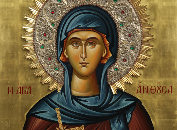 Η Αγία Ανθούσα ήταν θυγατέρα του αυτοκράτορα Κωνσταντίνου του Κοπρωνύμου. Γεννήθηκε δηλαδή μέσα στην ανακτορική δόξα και λαμπρότητα, όμως η ψυχή της αναζητούσε αλλού την παρηγοριά και την ηρεμία. Μάταια ο αυτοκράτορας πατέρας της προσπάθησε να την παντρέψει με κάποιο νέο ανάλογης γενιάς και θέσεως. Η Αγία Ανθούσα έφερε στην καρδιά της την θλίψη ότι ο πατέρας της ήταν εχθρός και πολέμιος των εικόνων και δεν επιθυμούσε σύζυγο με τα ίδια φρονήματα.