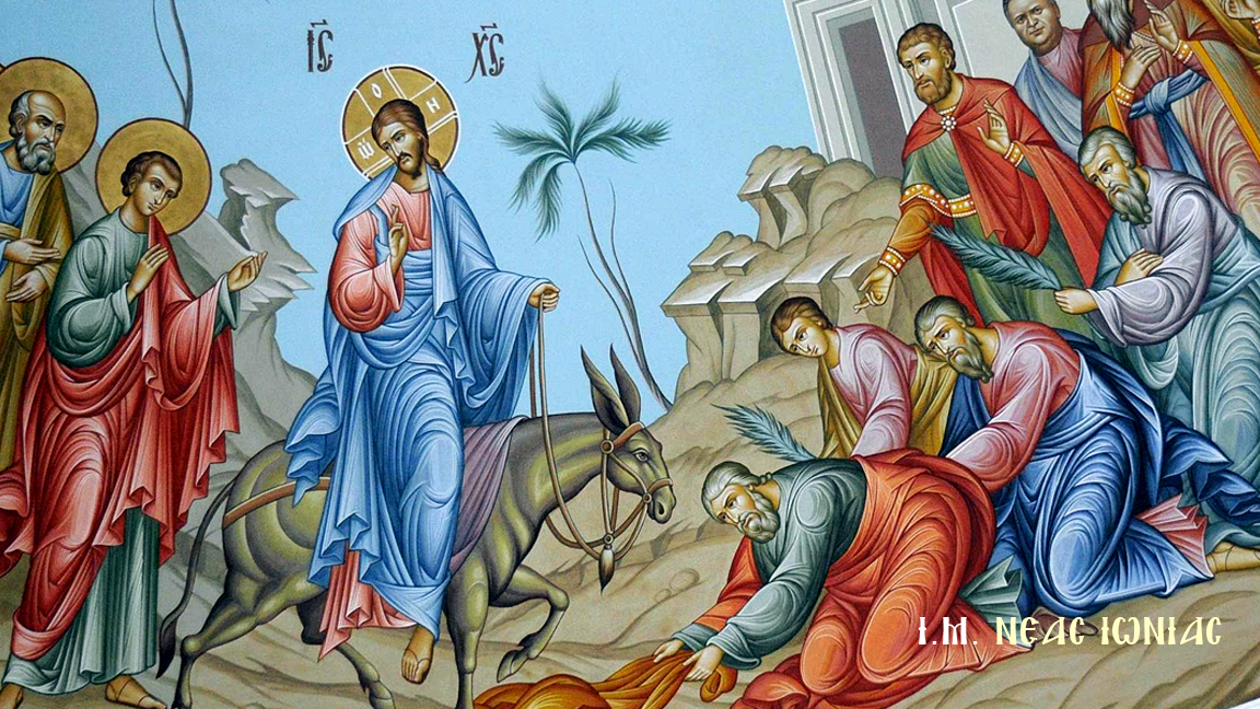 Ο Χριστός εισέρχεται στα Ιεροσόλυμα «επί πώλον όνου». Πορεύεται και οι Ισραηλίτες τον υποδέχονται με τιμές ως Βασιλιά. Εκείνος δεν δίνει ιδιαίτερη σημασία στις τιμές, δεν περιορίζεται στο πανηγύρι, στην πρόσκαιρη δόξα, αλλά προχωρεί στο σταυρό και την Ανάσταση.