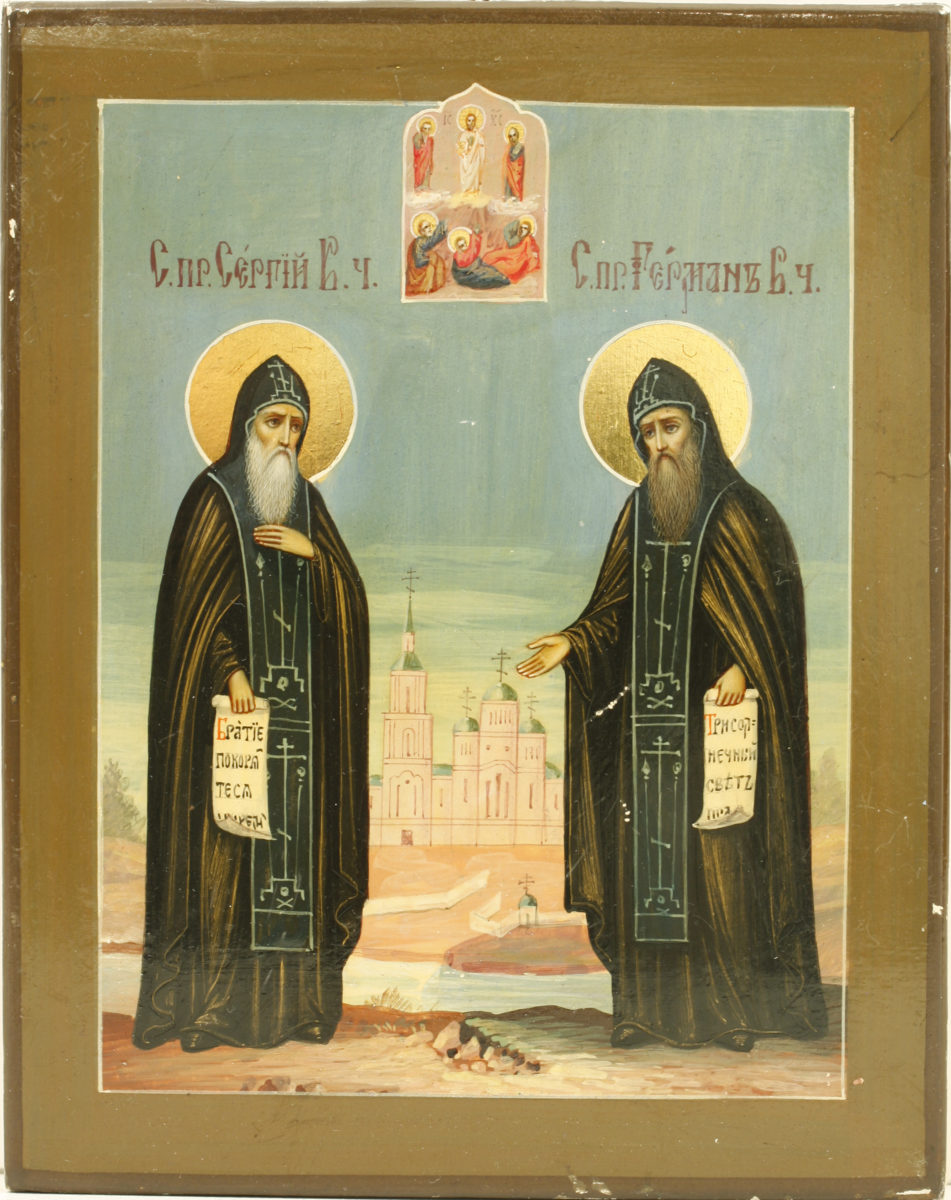 « Ω άγιοι συναγωνιστές! Έγινες αληθινά υπάκουος στο ευαγγέλιο του Χριστού, γιατί από αγάπη για τον Χριστό περιφρόνησες τον κόσμο και ό,τι υπάρχει μέσα του, σαν να ήταν ανύπαρκτο για σένα. Πήγες να ζήσεις σε ένα νησί στη θάλασσα και εκεί πολέμησες ενάντια στις μηχανορραφίες ενός αόρατου εχθρού. Νηστεύοντας, παρακολουθώντας και στέκεστε στις προσευχές σας τις νύχτες/ κάνατε τη σάρκα σας υπάκουη στο πνεύμα. Γι’ αυτό λάβατε τα στέφανα που σας άξιζαν από το δεξί χέρι του Παντοδύναμου. Και τώρα, όρθιοι μπροστά στην υπεραγία Τριάδα, προσευχηθείτε, οι μακάριοι πατέρες μας Σεργκέι και Ερμάν, για την προστασία της ειρήνης του χριστιανικού λαού και τη σωτηρία των ψυχών μας. » )