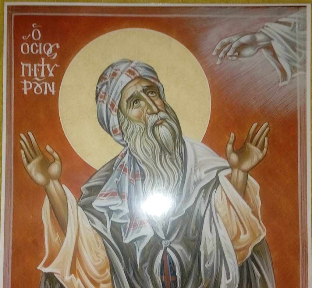 Ο Όσιος Πιτυρούν έκανε μαθητής του Μεγάλου Αντωνίου και πήρε από τις αρετές και τα χαρίσματα εκείνου, η δε εγκράτεια του εικονίζεται κατά τον αυστηρότατο ασκητισμό.