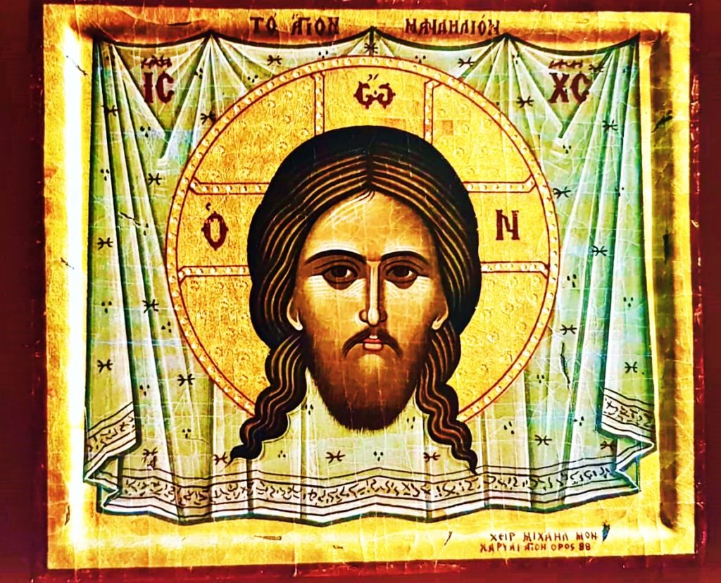 Bλέποντες δε όλοι το παράδοξον, κατεπλάγησαν και όσον ανέβαινε και εκατέβαινεν η φλόγα, ωσάν το πανί του καραβίου, όταν ριπίζεται από τον άνεμον, τόσον και αυτοί έκραζον το, Kύριε ελέησον, εις ώρας πολλάς. Ποιήσαντες δε ευχήν οι Iερείς, κατέπεσεν η φλόγα. Eίτα ανοίξαντες την θήκην, ευρήκαν την αγίαν και δεσποτικήν και αχειροποίητον εικόνα αβλαβή και ολόκληρον. Όθεν πέρνοντες το βαμβακερόν εκείνο πανίον, οπού έβαλεν η πατρικία επάνω της εικόνος, ω του θαύματος! ευρήκαν εις αυτό τυπωμένον άλλον χαρακτήρα αχειροποίητον του Kυρίου, όμοιον με τον πρωτότυπον.