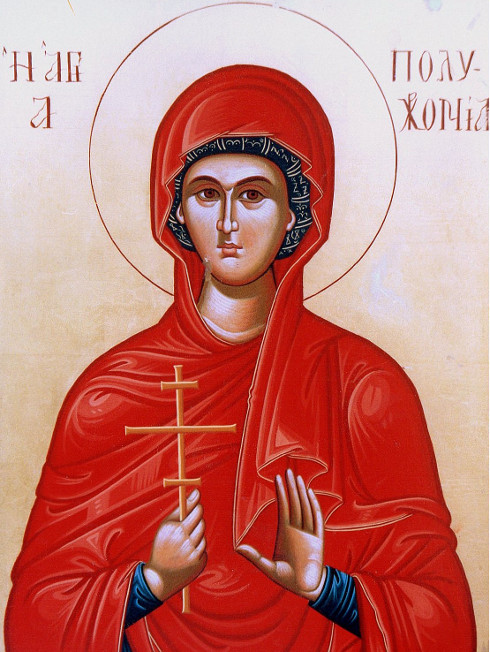 Η Αγία Μάρτυς Πολυχρονία ήταν μητέρα του Αγίου Μεγαλομάρτυρος Γεωργίου και καταγόταν από την πόλη Λύδδα (Διόσπολη) της Παλαιστίνης. Προερχόταν και εκείνη από φημισμένο και αρχοντικό γένος. Ήταν σεμνή και γενναία και πλημμυρισμένη από σωφροσύνη, καλοσύνη και γλυκύτητα. Απ’ όλα πιο πολύ η ψυχή της αγαπούσε τον Θεό, την προσευχή και την ταπείνωση. Ο χρόνος της κυλούσε με την ανάγνωση των Θείων Γραφών και την προσευχή. Τις προσευχές δε και τις αγρυπνίες της, η μακαρία Πολυχρονία, τις συνόδευε με εγκράτεια και νηστεία. Έτσι, αποσπασμένος ο νους της από τη γη υψωνόταν στον ουρανό και βυθιζόταν στη θεωρία του Θεού. Με αυτό τον τρόπο μεταμόρφωνε το γύρω χώρο της και άφηνε να διαχέεται στο ειδωλολατρικό περιβάλλον του συζύγου της Γεροντίου η πάντερπνη οσμή της πνευματικής ευωδίας.
