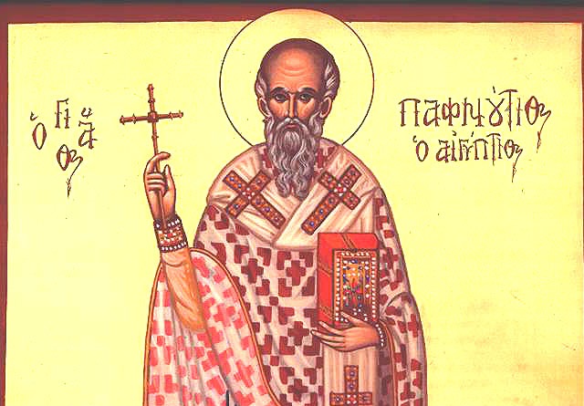 Καί τρόπων μέτοχος, καί θρόνων διάδοχος, τῶν Ἀποστόλων γενόμενος, τήν πρᾶξιν εὗρες θεόπνευστε, εἰς θεωρίας ἐπίβασιν· διά τοῦτο τόν λόγον τῆς ἀληθείας ὀρθοτομῶν, καί τῇ πίστει ἐνήθλησας μέχρις αἵματος, Ἱερομάρτυς Παφνούτιε· πρέσβευε Χριστῷ τῷ Θεῷ, σωθῆναι τάς ψυχάς ἡμῶν.