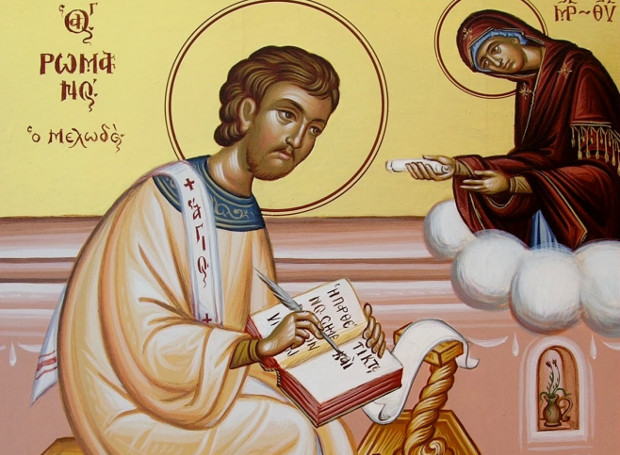 Ο Ρωμανός είχε μέτρια παιδεία και το ποιητικό ταλέντο του ήταν ακόμα άγνωστο. Διεκατέχετο όμως από μία βαθιά πίστη στην σεπτή μνήμη της Παναγίας της Παρθένου και τακτικά παρακολουθούσε στον Ναό της Παναγίας των Βλαχερνών τις κατανυκτικές ολονυκτίες. Σε μία τέτοια, στην γιορτή των Χριστουγέννων, που παραβρέθηκε η ψυχή του γέμισε με κατάνυξη και όταν γύρισε στο κελί του είδε όνειρο την Παναγία να του προσφέρει ένα βιβλίο και να του λέει να το καταφάει. Ο Ρωμανός από την επίδραση τού ονείρου συνέθεσε για την γέννηση τού Χριστού το τροπάριο «Ἡ Παρθένος σήμερον τὸν ὑπερούσιον τίκτει καὶ ἡ γῆ τὸ σπήλαιον τῷ ἀπροσίτω προσάγει..». Από την στιγμή αυτή η ποιητική επιφοίτηση του οσίου Ρωμανού έμεινε άσβεστη και αναδείχτηκε ο εξωχότερος και μεγαλύτερος μελωδός της Εκκλησίας μας.
