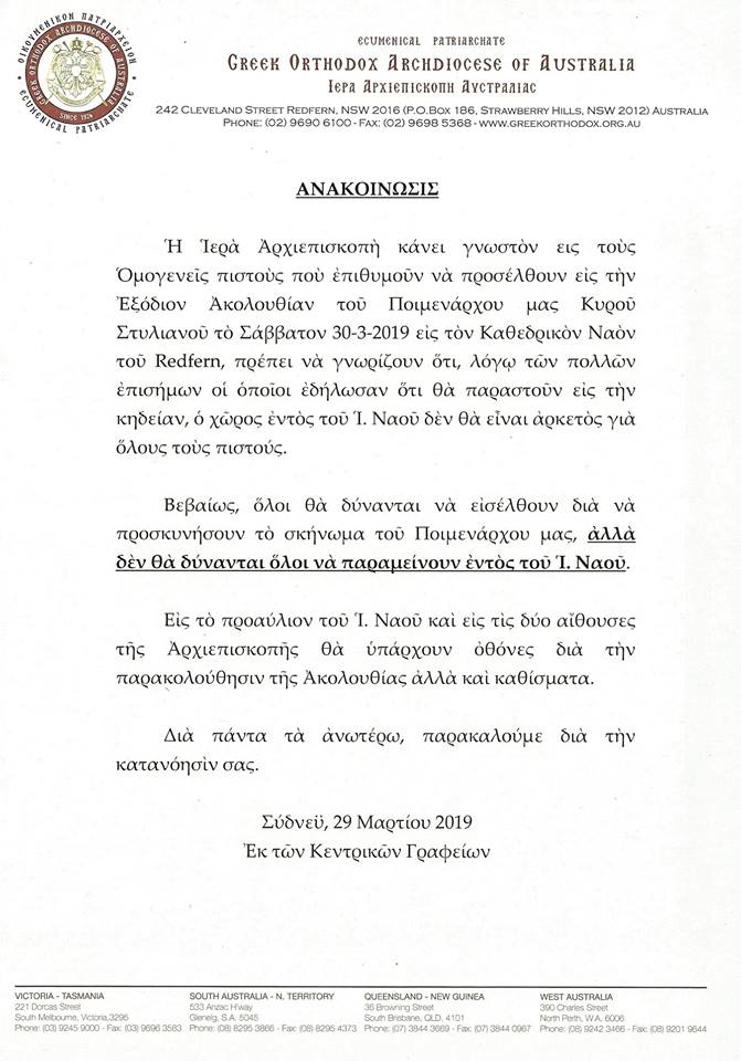 Η Ιερά Αρχιεπισκοπή Αυστραλίας εξέδωσε ανακοίνωση σχετικά με την εξόδιο ακολουθία, γνωστοποιώντας ότι στον προαύλιο χώρο του ναού και στις δύο αίθουσες της Αρχιεπισκοπής θα τοποθετούν οθόνες και καθίσματα για όσους επιθυμούν να την παρακολουθήσουν. Επίσης, η τελετή θα προβληθεί σε απευθείας σύνδεση στο κανάλι της Αρχιεπισκοπής στο Youtube και στην σελίδα της στο Facebook.