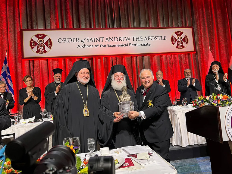 Στην συνέχεια, ο Πατριάρχης Θεόδωρος ευχαρίστησε θερμά άπαντες για την προσφορά τους, παρασημοφορώντας τον Αρχιεπίσκοπο Αμερικής κ. Ελπιδοφόρο και τον Δρα Αντώνιο Λυμπεράκη, ενώ προσέφερε, δω συμβολικό δώρο, μια γόνδολα στον πνευματικό επικεφαλής του Τάγματος «Άγιος Ανδρέας», π. Αλέξανδρο Καρλούτσο και έναν αετό στον Τζον Κατσιματίδη.