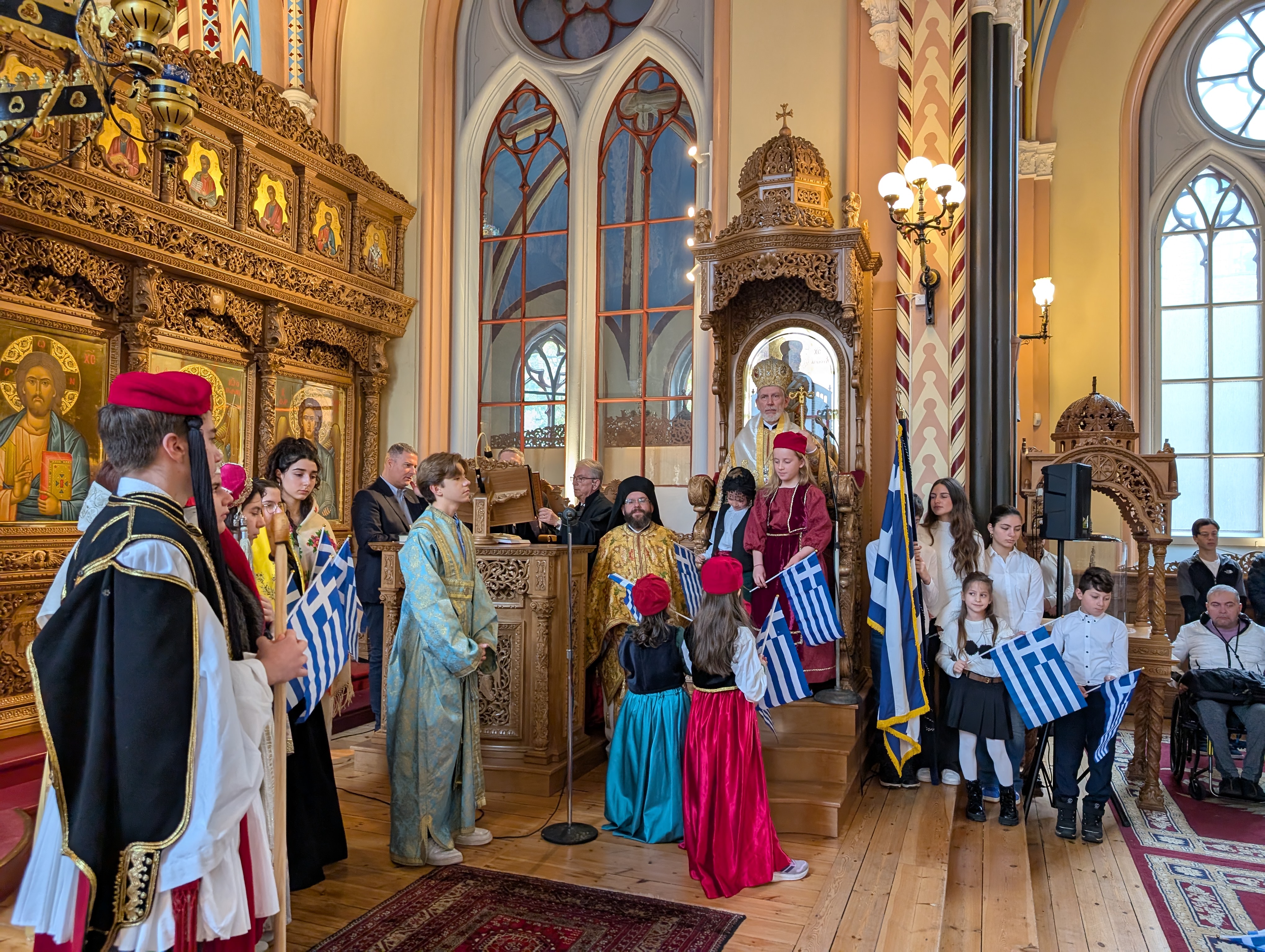 Στην συνέχεια, ο Ποιμενάρχης κ. Κλεόπας μίλησε επικαίρως για τα πολλαπλά μηνύματα της ημέρας και της Εθνικής Επετείου και συνεχάρη τους παρισταμένους και κυρίως τα παιδιά, τα οποία με την συμμετοχή και τις παραδοσιακές φορεσιές τους μετέφεραν τον παλμό και το μήνυμα της διπλής εορτής, ευχαρίστησε ιδιαιτέρως την κ. Αλεξάνδρα Ζορπίδου, η οποία πάντοτε επιμελείται της παραδοσιακής ενδυμασίας μικρών και μεγάλων, όπως επίσης και το Λύκειο Ελληνίδων Στοκχόλμης.