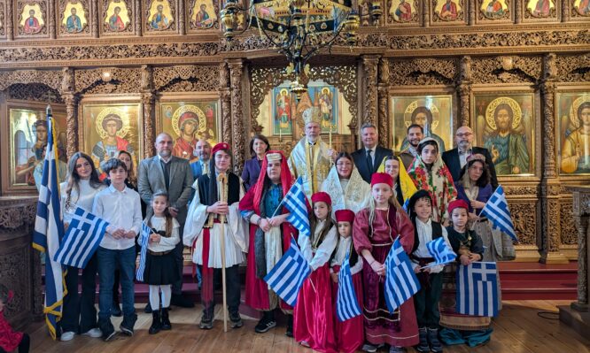 Στην συνέχεια, ο Ποιμενάρχης κ. Κλεόπας μίλησε επικαίρως για τα πολλαπλά μηνύματα της ημέρας και της Εθνικής Επετείου και συνεχάρη τους παρισταμένους και κυρίως τα παιδιά, τα οποία με την συμμετοχή και τις παραδοσιακές φορεσιές τους μετέφεραν τον παλμό και το μήνυμα της διπλής εορτής, ευχαρίστησε ιδιαιτέρως την κ. Αλεξάνδρα Ζορπίδου, η οποία πάντοτε επιμελείται της παραδοσιακής ενδυμασίας μικρών και μεγάλων, όπως επίσης και το Λύκειο Ελληνίδων Στοκχόλμης.