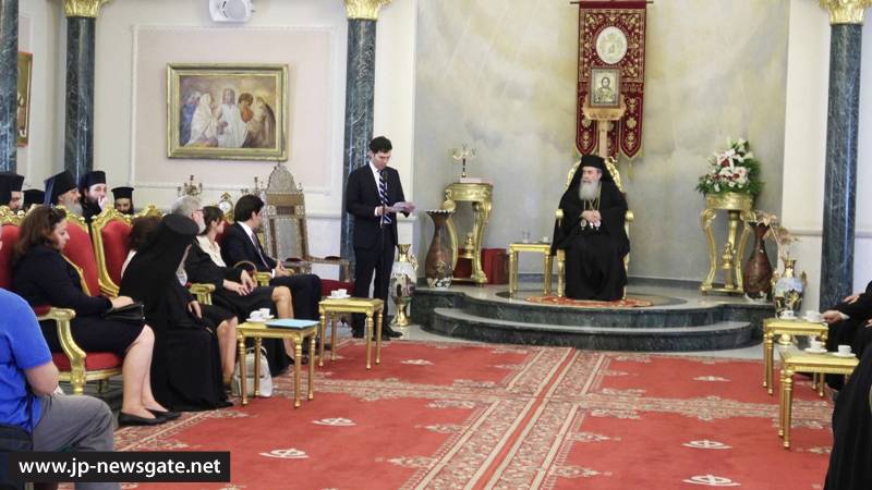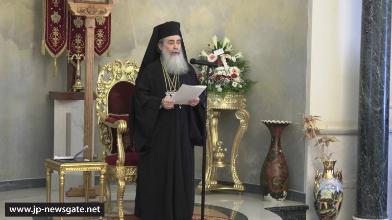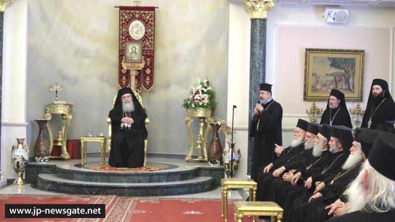 Μετά τήν Δοξολογίαν ἠκολούθησεν ἡ ἄνοδος εἰς τό Πατριαρχεῖον, ἔνθα ὁ Μακαριώτατος Πατριάρχης Ἱεροσολύμων προσεφώνησε τούς προσελθόντας διά τῆς κάτωθι προσφωνήσεως Αὐτοῦ ἑλληνιστί, ὡς ἕπεται:
