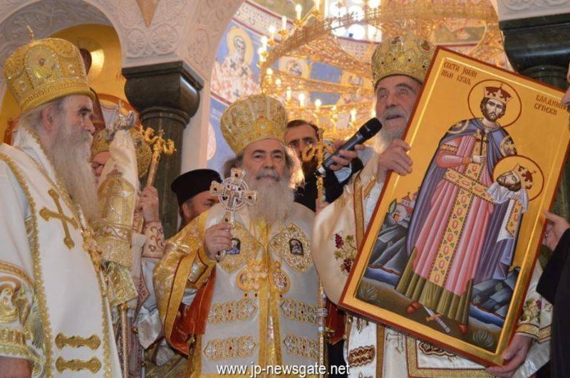Ἐν συνεχείᾳ τῆς προσφωνήσεως ταύτης ὁ Μακαριώτατος Πατριάρχης Ἱεροσολύμων κ. Θεόφιλος ἐπέδωσεν εἰκόνα τῆς Θεοτόκου Ἱεροσολυμιτίσσης εἰς τόν Μακαριώτατον Πατριάρχην Σερβίας κ. Εἰρηναῖον καί τόν Σεβασμιώτατον Μητροπολίτην Μαυροβουνίου κ. Ἀμφιλόχιον, ὁ δέ Μητροπολίτης Μαυροβουνίου ἐπέδωσεν εἰκόνα τοῦ ἁγίου Ἰωάννου Βλαδιμήρου εἰς τόν Πατριάρχην Ἱεροσολύμων.