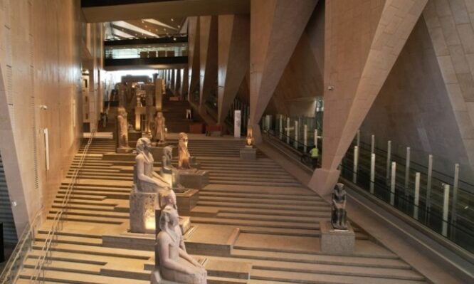 Όταν το μουσείο ανοίξει για το κοινό την Τρίτη, τους επισκέπτες θα υποδέχεται στο τεράστιο αίθριο το πιο μνημειώδες άγαλμα του μουσείου – 83 τόνοι γρανίτη, ύψους έντεκα μέτρων – που αναπαριστά τον Ραμσή Β΄, τον Φαραώ που βασίλευσε στην Αίγυπτο για 66 χρόνια πριν από περισσότερα από 3.000 χρόνια.