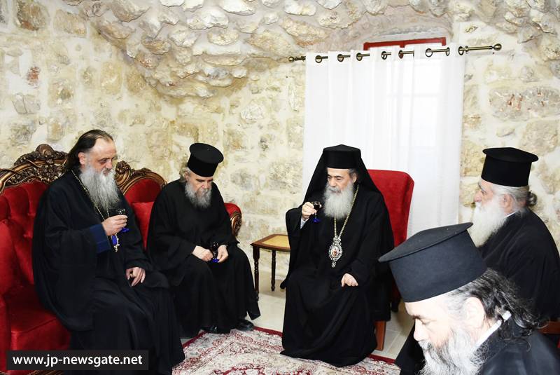 Μετά τήν θ. Λειτουργίαν, ὁ καθηγούμενος καί ἀνακαινιστής τῆς Ἱερᾶς Μονῆς τῶν Ἀρχαγγέλων καί Γραμματεύς τῆς Ἁγίας καί Ἱερᾶς Συνόδου Σεβασμιώτατος Ἀρχιεπίσκοπος Λύδδης κ. Δημήτριος ἐδεξιώθη τήν Ἀρχιερατικήν Συνοδείαν καί τό ἐκκλησίασμα εἰς τό ἡγουμενεῖον.