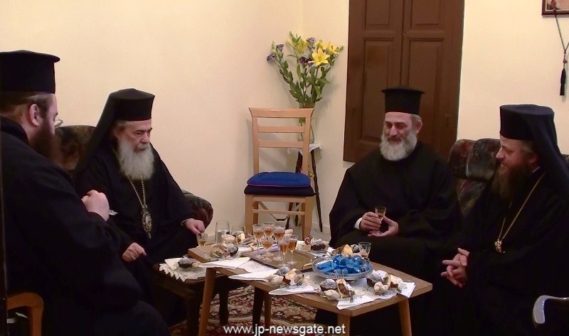 Αμέσως μετά το πέρας της Θείας Λειτουργίας ο καθηγούμενος Αρχιμανδρίτης π. Μακάριος δεξιώθηκε φιλοφρόνως στο ηγουμενείο την Αγιοταφική Συνοδεία και την Αρχιερατική.
