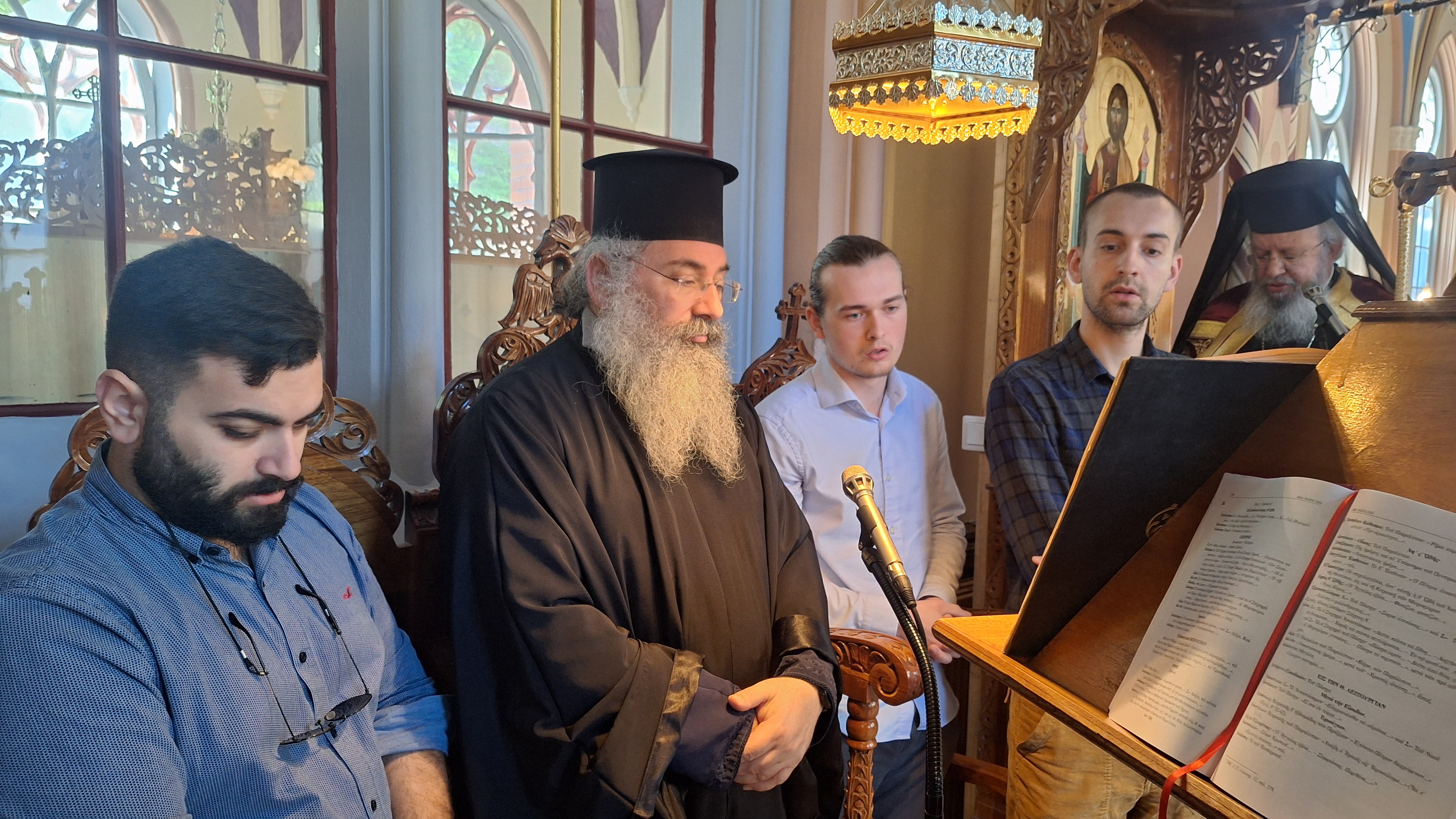 Τον χορό του δεξιού αναλογίου διηύθυνε ο προσελθών επί τούτο εκ ΚύπρουΑιδεσιμολ. Πρωτοπρεσβύτερος κ. Δημήτριος Δημοσθένους, Προϊστάμενος του Καθεδρικού Ναού Αποστόλου Βαρνάβα Λευκωσίας. Έψαλαν, επίσης, ο Δρ. Γεώργιος Σιδηράς, ο κ. Μίλτος Σουλτάνης, ο Δρ. Ιωάννης Ρηγόπουλος, ο κ. Παναγιώτης Δημοσθένους και οι Δδες Ηλιάνα Αντωνίου και Ιωάννα Δημοσθένους.