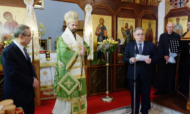 Στο τέλος της Θ. Λειτουργίας, ο Θεοφιλέστατος ανέγνωσε το συγχαρητήριο γράμμα του Σεβ. Αρχιεπισκόπου Θυατείρων και Μεγάλης Βρεταννίας κ. Νικήτα, προς τον νέο Επίτιμο Πρόεδρο της Κοινότητος κ. Ανδρέα Μακρή.