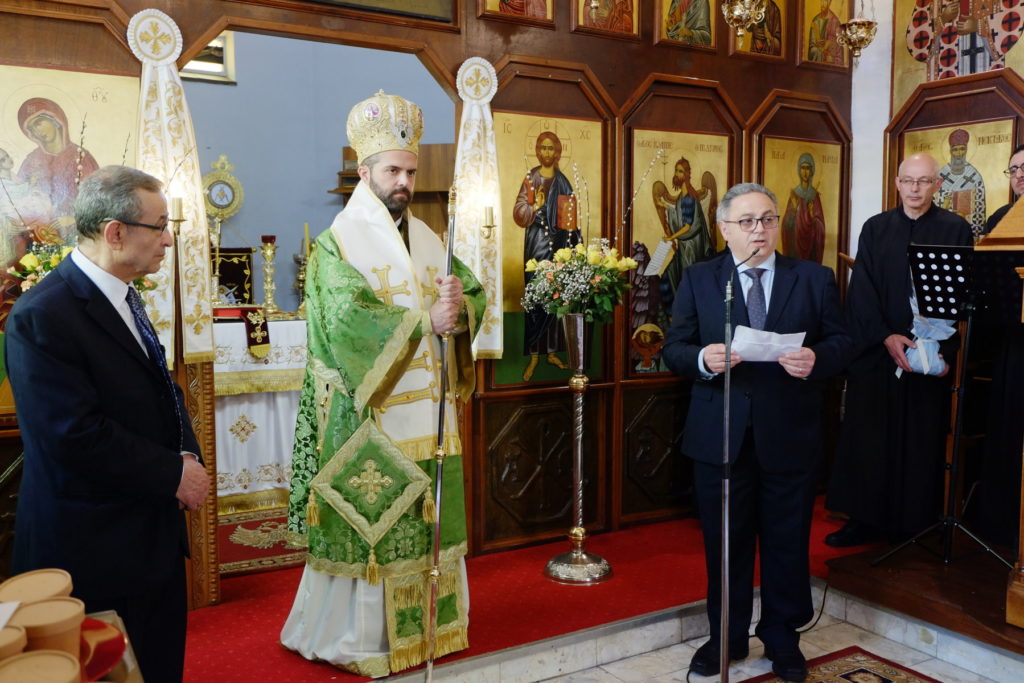 Στο τέλος της Θ. Λειτουργίας, ο Θεοφιλέστατος ανέγνωσε το συγχαρητήριο γράμμα του Σεβ. Αρχιεπισκόπου Θυατείρων και Μεγάλης Βρεταννίας κ. Νικήτα, προς τον νέο Επίτιμο Πρόεδρο της Κοινότητος κ. Ανδρέα Μακρή.