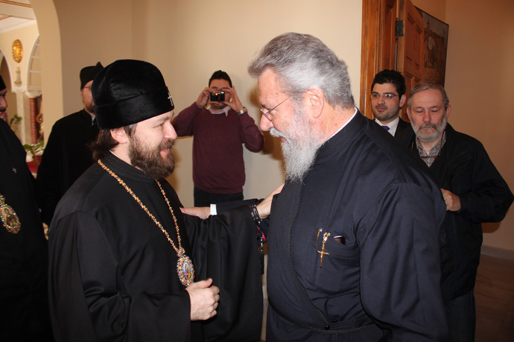 Για θέματα συνεργασίας των κατά τόπους Ορθοδόξων Εκκλησιών καθώς και για ζητήματα που αφορούν τις διμερείς σχέσεις μεταξύ των Εκκλησιών Ρωσίας και Κύπρου συζήτησαν ο μητροπολίτης Βολοκολάμσκ Ιλαρίωνας με τον Αρχιεπίσκοπο Κύπρου κ. Χρυσόστομο κατά την πρόσφατη επίσκεψη του πρώτου στο νησί.