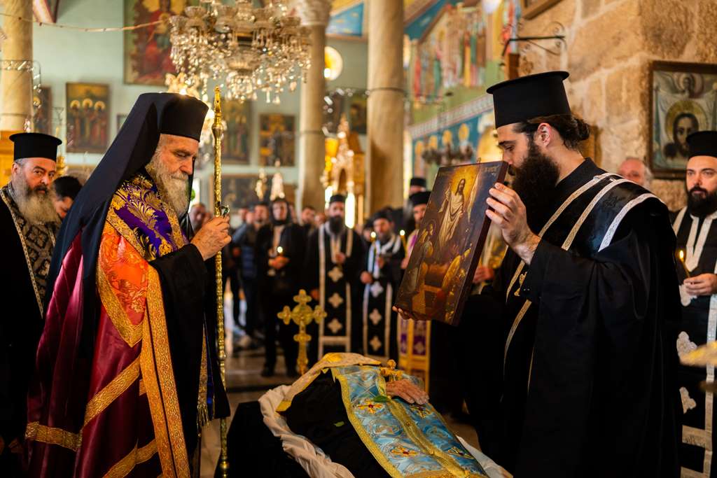 Διά τήν ἐξόδιον Ἀκολουθίαν καί τήν ταφήν αὐτοῦ μετέβησαν εἰς τήν ἐν λόγῳ Ἱεράν Μονήν ὁ Πατριαρχικός Ἐπίτροπος Σεβασμιώτατος Μητροπολίτης Καπιτωλιάδος κ. Ἡσύχιος μετά τῶν Ἁγιοταφιτῶν Πατέρων καί ἐτέλεσαν αὐτήν, συνιερουργούντων τῶν Σεβασμιωτάτων Ἀρχιεπισκόπων Γεράσων κ. Θεοφάνους καί Ἀβήλων κ. Δωροθέου, τῶν Ἱερομονάχων τοῦ Πατριαρχείου Ἱεροσολύμων καί τοῦ Πνευματικοῦ τοῦ Ἁγίου Σάββα Ἀρχιμανδρίτου π. Εὐδοκίμου καί τῶν Ἱερέων τῶν ὁμόρων περιοχῶν τῆς Βηθλεέμ, συμπροσευχομένων μοναζουσῶν καί μοναχῶν ἐλθόντων ἐξ Ἱεροσολύμων καί πλῆθος λαοῦ ἐκ τοῦ ποιμνίου τῆς Βηθλεέμ.