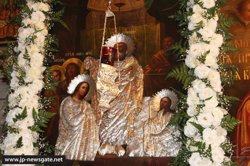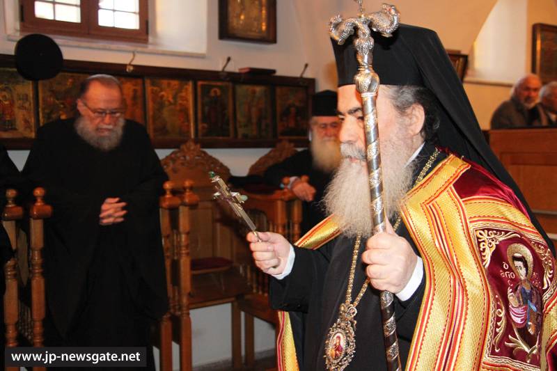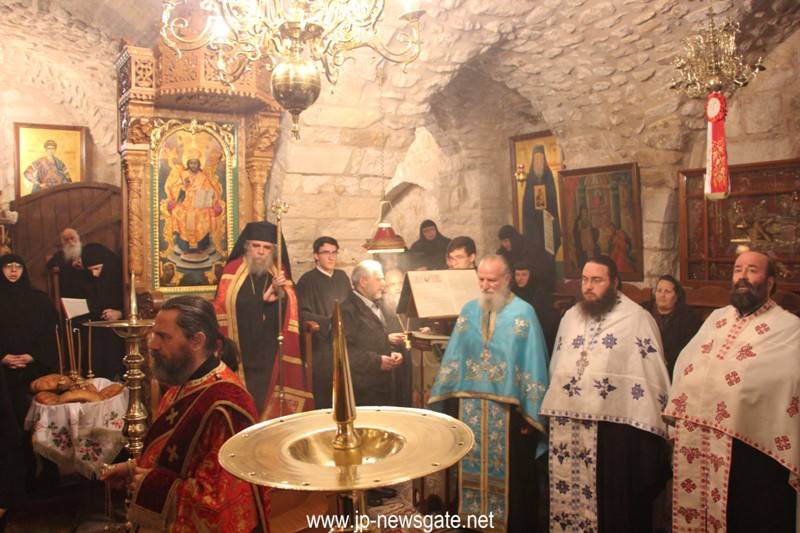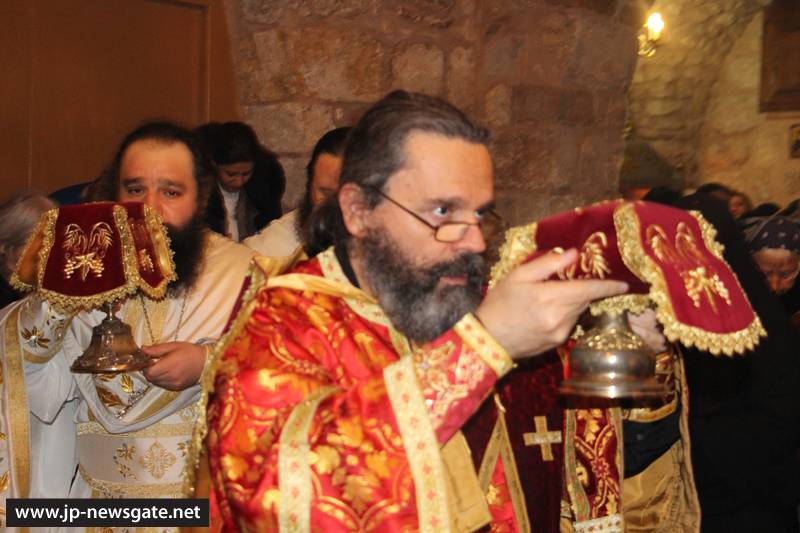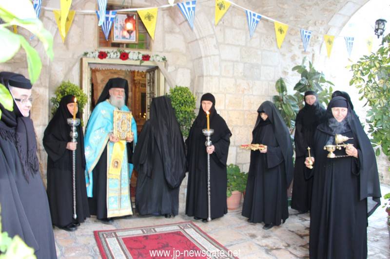 Διά τόν ἑορτασμόν τοῦ γεγονότος τούτου ἐτελέσθη Ἑσπερινός ἀφ᾽ ἑσπέρας καί θεία Λειτουργία τήν πρωΐαν εἰς τήν ὡς ἄνω Ἱεράν Μονήν τοῦ Πατριαρχείου, προεξάρχοντος τοῦ Γέροντος Ἀρχιγραμματέως Σεβασμιωτάτου Ἀρχιεπισκόπου Κωνσταντίνης κ. Ἀριστάρχου, συλλειτουργούντων αὐτῷ τοῦ Ἀρχιμανδρίτου π. Ἰγνατίου, ἡγουμένου εἰς τό Χωρίον τῶν Ποιμένων, τοῦ Ἀρχιμανδρίτου π. Μακαρίου ἡγουμένου εἰς τήν Ἱ. Μονήν Ἁγίου Νικοδήμου, τοῦ Ἀρχιμανδρίτου π. Παϊσίου ἡγουμένου εἰς τήν Ἱ. Μονήν Προφήτου Ἠλιοῦ, ψάλλοντος δεξιά τοῦ Πρωτοψάλτου τοῦ Ναοῦ τῆς Ἀναστάσεως Ἀρχιμανδρίτου π. Ἀριστοβούλου, τοῦ Ἀρχιμανδρίτου π. Εὐσεβίου καί τῶν μαθητῶν τῆς Πατριαρχικῆς Σχολῆς, τοῦ ἰατροῦ κ. Νικολάου Νίνου καί τοῦ Τάκη καί προσκυνητῶν ἐκ Κύπρου ἑλληνιστί καί τῆς χορῳδίας τοῦ Καθεδρικοῦ Ναοῦ τοῦ Ἁγίου Ἰωακώβου ἀραβιστί ὑπό τόν κ. Ριμόν Κάμαρ ἀριστερά, παρουσίᾳ μελῶν τοῦ Ἑλληνικοῦ Γενικοῦ Προξενείου, τῇ συμμετοχῇ τῶν μοναζουσῶν τῆς Μονῆς καί πολλῶν μοναζουσῶν καί προσκυνητῶν ἐξ Ἑλλάδος, Ρωσίας, Ρουμανίας, Οὐκρανίας, ἐντοπίων Ἀραβοφώνων καί μελῶν τῆς Ἑλληνικῆς παροικίας, προσευχομένων ἐν κατανύξει, χαρᾷ καί ἀγαλλιάσει.