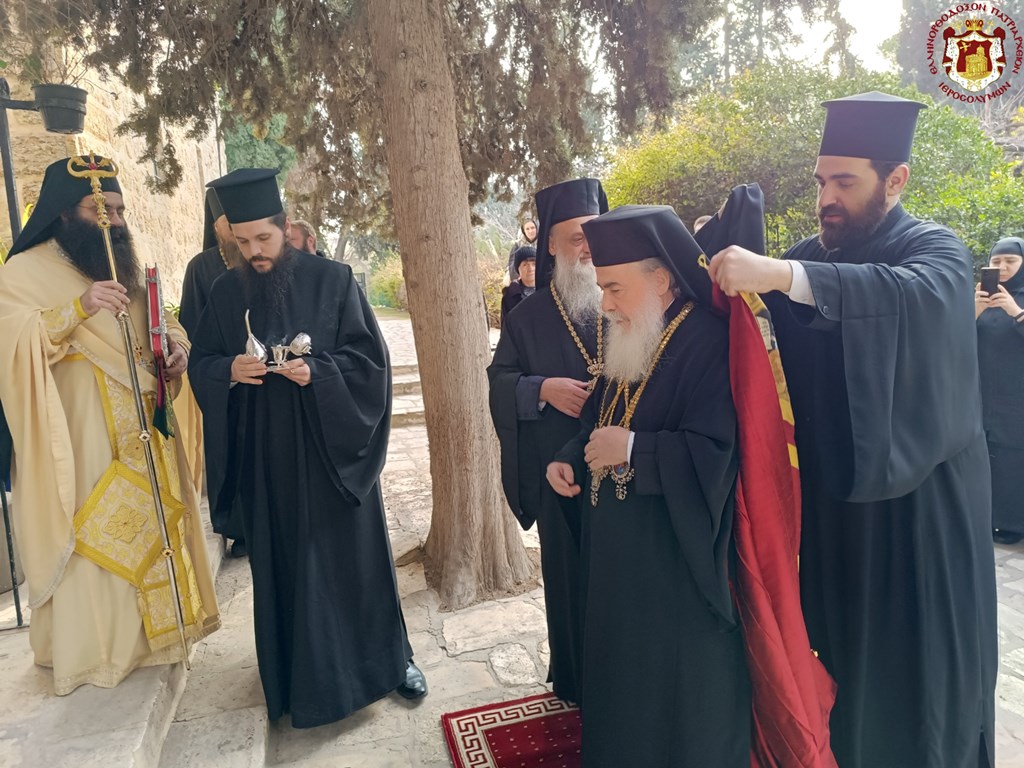 Τήν Κυριακήν, 3ην/16ην Φεβρουαρίου 2025, ἑωρτάσθη ἡ μνήμη τοῦ Ἁγίου Συμεών τοῦ Θεοδόχου εἰς τήν Ἱεράν αὐτοῦ Μονήν, τήν κειμένην εἰς τήν Νέαν Πόλιν Ἱερουσαλήμ, εἰς Κατά Μόνας, εἰς Ναόν, ἔνθα καί ὁ τάφος αὐτοῦ καί μικρόν τεμάχιον τοῦ λειψάνου αὐτοῦ, διά θείας Λειτουργίας, τῆς ὁποίας προεξῆρξεν ἡ Α.Θ.Μ. ὁ Πατήρ ἡμῶν καί Πατριάρχης Ἱεροσολύμων κ.κ. Θεόφιλος, συλλειτουργούντων Αὐτῷ τοῦ Σεβασμιωτάτου Μητροπολίτου Ναζαρέτ κ. Κυριακοῦ, τοῦ Σεβασμιωτάτου Ἀρχιεπισκόπου Κωνσταντίνης κ. Ἀριστάρχου, τοῦ Σεβασμιωτάτου Ἀρχιεπισκόπου Θαβωρίου κ. Μεθοδίου καί τοῦ Σεβασμιωτάτου Ἀρχιεπισκόπου Λύδδης κ. Δημητρίου, Ἁγιοταφιτῶν Ἱερομονάχων, ὧν πρῶτος ὁ Γέρων Καμαράσης Ἀρχιμανδρίτης π. Νεκτάριος, τοῦ Ἡγουμένου τῆς Μπετζάλλας καί τῆς Ἱερᾶς Μονῆς Ποιμένων Ἀρχιμανδρίτου π. Ἰγνατίου, τοῦ Ἡγουμένου τῆς Μονῆς τοῦ Τιμίου Σταυροῦ Ἀρχιμανδρίτου π. Χριστοδούλου, τοῦ Ἀρχιμανδρίτου π. Βασιανοῦ τῆς Ρωσικῆς Πνευματικῆς Ἀποστολῆς εἰς Ἱεροσόλυμα (MISSIA), τοῦ Ἀρχιδιακόνου π. Μάρκου καί τοῦ Ἱεροδιακόνου π. Εὐλογίου, Πρεσβυτέρων καί διακόνων ἄλλων Ὀρθοδόξων Ἐκκλησιῶν, ψάλλοντος τοῦ Σεβασμιωτάτου Ἀρχιεπισκόπου Μαδάβων κ. Ἀριστοβούλου καί προσευχομένων Ἑλληνοφώνων, Ρουμανοφώνων, Ρωσωφώνων πιστῶν, Σέρβων καί Γεωργιανῶν παρουσίᾳ τῆς ἀντιπροσώπου του Ἑλληνικοῦ Γενικοῦ Προξενείου κ. Ἀθανασίας Μάλιου.