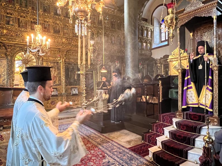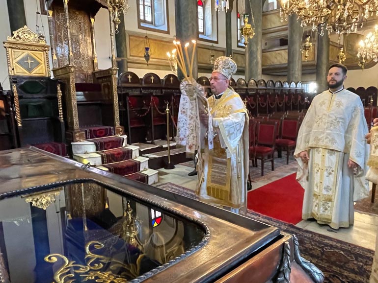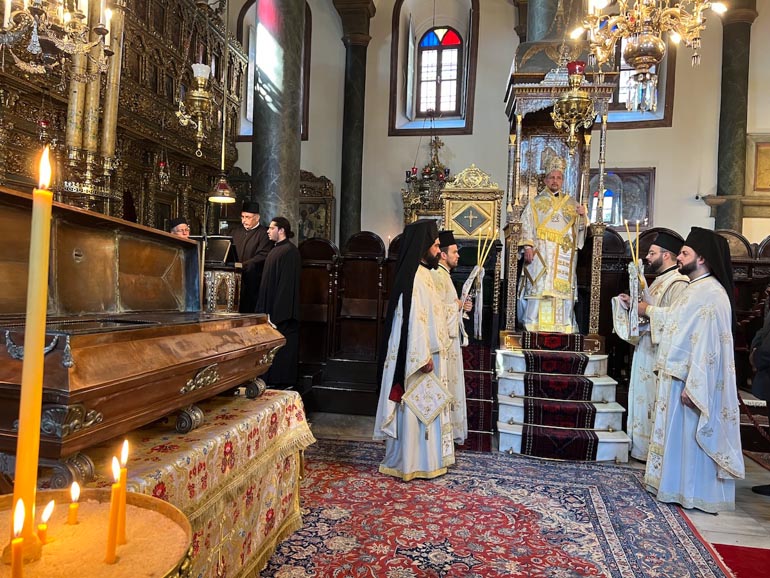 Το πρωϊ της ίδιας ημέρας, εορτή της Αγίας Σολομονής, της οποίας το ιερό λείψανο φυλάσσεται στον Πάνσεπτο Πατριαρχικό Ναό, ο κ. Βαρθολομαίος συμπροσευχήθηκε κατά τη Θεία Λειτουργία, που τελέστηκε ιερουργούντος του Μητροπολίτου Κυδωνιών κ. Αθηναγόρα.