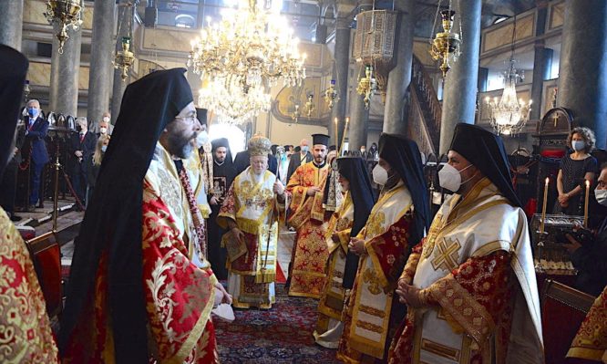 Ἡ τεθεσπισμένη Πατριαρχική καί Συνοδική Θεία Λειτουργία ἐν τῷ Πανσέπτῳ Πατριαρχικῷ Ναῷ τελεῖται καί ἐφέτος. Σήμερον παρίστανται ὡς προσκυνηταί, συμπροσευχόμενοι εὐλαβῶς, συλλειτουργούμενοι οἱ Ὀφφικιάλιοι τῆς Ἀδελφότητος “ΠΑΝΑΓΙΑ Η ΠΑΜΜΑΚΑΡΙΣΤΟΣ” Ὁ Ἐντιμολ. Ἄρχων Ἔξαρχος κ. Ἀθανάσιος Μαρτῖνος, Πρόεδρος, μετ’ἐνίων ἐκ τῶν ἐπιλέκτων μελῶν αὐτῆς. Ἐξακολουθεῖ ἀνελλειπῶς ἡ τιμή, ἡ εὐχή, ἡ δέησις τῆς Μητρός Ἐκκλησίας ἐπί πλέον δι’ὂλους τούς προσελθόντας καί τούς δι’εὐλόγους αἰτίας ἐκ τῆς Πανδημίας τοῦ Κορωνοϊοῦ (Covid-19) ἀπολειφθέντας.