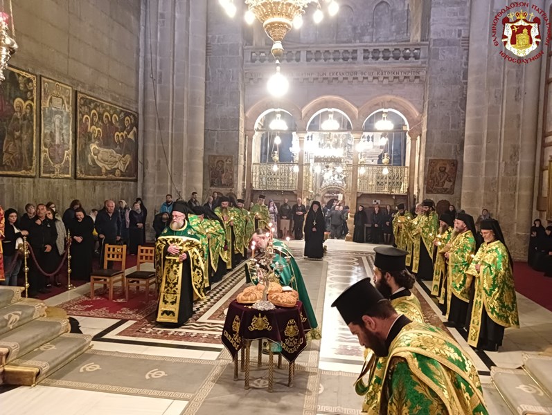 Πρός τιμήν τοῦ Τιμίου καί Ζωοποιοῦ Σταυροῦ καί λῆψιν βοηθείας ἐξ αὐτοῦ, ἔλαβε χώραν θεία Λειτουργία τήν πρωΐαν εἰς τόν Πανάγιον Τάφον, προεξάρχοντος καί πάλιν τοῦ Καθηγουμένου τῆς Ἁγιοταφιτικῆς Ἀδελφότητος Μακαριωτάτου Πατρός ἡμῶν καί Πατριάρχου Ἱεροσολύμων κ.κ. Θεοφίλου καί συλλειτουργούντων τῶν Ἀρχιερέων τοῦ Πατριαρχείου, Σεβασμιωτάτου Μητροπολίτου Καπιτωλιάδος κ. Ἡσυχίου, τῶν Σεβασμιωτάτων Ἀρχιεπισκόπων Γεράσων κ. Θεοφάνους, Κωνσταντίνης κ. Ἀριστάρχου καί Σεβαστείας κ. Θεοδοσίου, τοῦ Ἀρχιεπισκόπου Ἰωάννου τοῦ Πατριαρχείου τῆς Σερβίας, Ἁγιοταφιτῶν Ἱερομονάχων καί διακόνων, ψαλλόντων καί πάλι τοῦ Τυπικάρη τοῦ Ἱεροῦ Ναοῦ τῶν Ἁγίων Κωνσταντίνου καί Ἑλένης Ἀρχιμανδρίτου π. Ἀλεξίου δεξιά καί τοῦ κ. Βασιλείου Γκοτσοπούλου ἀριστερά (καί τοῦ Ἱεροδιακόνου π. Συμεών βοηθοῦντος λόγῳ ἀσθενείας), παρουσίᾳ τοῦ Γενικοῦ Προξένου τῆς Ἑλλάδος εἰς τά Ἱεροσόλυμα κ. Εὐαγγέλου Βλιώρα καί τῆς κ. Χριστίνης Ζαχαριουδάκη καί τινων ἄλλων μελῶν τοῦ Προξενείου.