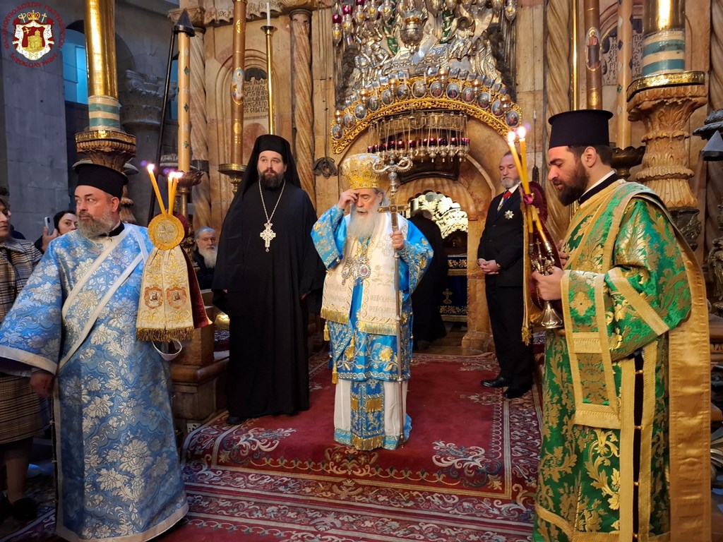 Ἠκολούθησεν ἡ Πατριαρχική θεία Λειτουργία εἰς τόν Πανάγιον και Ζωοδόχον Τάφον, συλλειτουργούντων τοῦ Μακαριωτάτου τῶν Σεβασμιωτάτων Ἀρχιεπισκόπων Κωνσταντίνης κ. Ἀριστάρχου καί Σεβαστείας κ. Θεοδοσίου, Ἁγιοταφιτῶν Ἱερομονάχων, Ἀραβοφώνων καί Ρωσοφώνων Πρεσβυτέρων καί τοῦ ἐκπροσώπου τοῦ Πατριαρχείου Μόσχας Ἀρχιμανδρίτου π. Βασιανοῦ καί τοῦ ἐκπροσώπου τοῦ Πατριαρχείου Ρουμανίας Ἀρχιμανδρίτου π. Ἰωάννου καί ἱερέων ἄλλων χωρῶν, ψαλλούσης χορῳδίας ὑπό τόν Πρωτοψάλτην διάκονον π. Ευστάθιον Τσουμάνην καί τόν Ἱεροδιάκονον π. Συμεών, παρουσίᾳ τοῦ Γενικοῦ Προξένου τῆς Ἑλλάδος εἰς Ἱεροσόλυμα κ. Δημητρίου Ἀγγελοσοπούλου.