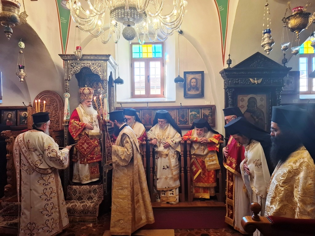 Ἡ προσκύνησις δέ καί ἀναστήλωσις τῶν ἁγίων εἰκόνων δέν ἀποτελεῖ ἁπλῶς ἱστορικόν γεγονός, ἀλλ΄ ἀφορᾷ εἰς τό μέγα μυστήριον τῆς θείας καί σωτηριώδους Οἰκονομίας. Διό καί ἡμεῖς, παρά τήν ἐπισυμβαίνουσαν πολεμικήν κρίσιν (καί τήν συνέπειαν αὐτῆς, μή δυνηθέντες νά κατέλθωμεν εἰς τόν Πανίερον Ναόν τῆς Ἀναστάσεως μετέβημεν εἰς τόν τοῦ κεντρικοῦ ἡμῶν Μοναστηρίου Ναόν τῶν ἁγίων Θεοστέπτων  καί Μεγάλων Κωνσταντίνου καί Ἑλένης, ἔνθα ἐτελέσαμεν τήν «Μεγάλην Παρρησίαν» τῆς Α΄ Κυριακῆς τῶν Νηστειῶν, τοὐτέστιν τήν Πατριαρχικήν θείαν Λειτουργίαν , συλλειτουργούντων ἡμῖν τῶν Τιμίων μελῶν τῆς Ἁγιοταφιτικῆς ἡμῶν Ἀδελφότητος Ἀρχιερέων , Ἱερέων,  Ἱεροδιακόνων καί συμπροσευχομένων μοναχῶν, μοναζουσῶν καί παρεπιδημούντων εὐλαβῶν προσκυνητῶν.