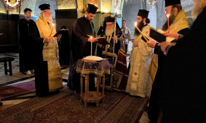 Τήν πρωΐαν τῆς Δευτέρας, 18ης /31ης  Ἰουλίου 2023, μετά τήν θείαν Λειτουργίαν, ἡ ὁποία ἐτελέσθη ἐπί τοῦ Φρικτοῦ Γολγοθᾶ, προεξάρχοντος τοῦ Σεβασμιωτάτου Ἀρχιεπισκόπου Κωνσταντίνης κ. Ἀριστάρχου, ἔλαβε χώραν τό τεσσαρακονθήμερον Μνημόσυνον ὑπό τῆς Ἁγιοταφιτικῆς Ἀδελφότητος τοῦ μακαριστοῦ Πατριαρχικοῦ Ἐπιτρόπου Ἄκκρης – Πτολεμαΐδος Ἀρχιμανδρίτου π. Φιλοθέου, τελειωθέντος ἐν τῇ ἐργασίᾳ συντηρήσεως τοῦ Ἱεροῦ Ναοῦ Ἁγίου Γεωργίου Ἄκκρης.
