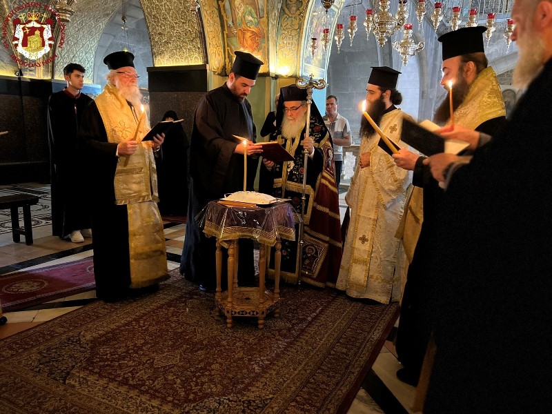 Τοῦ μνημοσύνου τούτου προεξῆρξε κατελθών ἐκ τοῦ Πατριαρχείου ὁ Μακαριώτατος Πατήρ ἡμῶν καί Πατριάρχης Ἱεροσολύμων κ.κ. Θεόφιλος, συνιερουργούντων Αὐτῷ τῶν Ἁγιοταφιτῶν Ἀρχιερέων, Ἱερομονάχων καί Ἱεροδιακόνων καί συμπροσευχομένων μοναχῶν, μοναζουσῶν καί πιστῶν, ἐκτιμώντων τήν μνήμην τοῦ ἐκλιπόντος καί δεομένων ὑπέρ ἀναπαύσεως τῆς ψυχῆς αὐτοῦ ἐν χώρᾳ ζώντων μετά δικαίων.