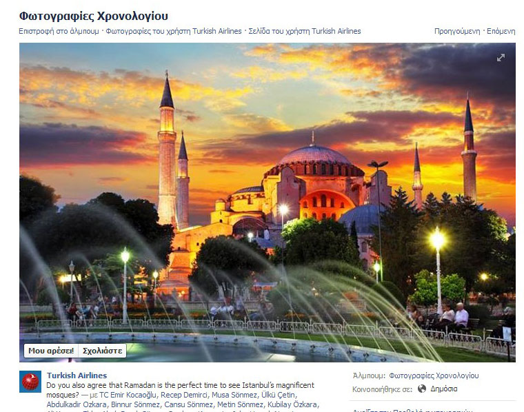 Η φωτογραφία η οποία έχει ληφθεί με τέτοιο τρόπο ώστε να είναι ορατοί και οι τέσσερις μιναρέδες, έχει αναρτηθεί στην επίσημη ιστοσελίδα των Τουρκικών Αερογραμμών στο Facebook και όπως φαίνεται έγινε εσκεμμένα. Άλλωστε το πιο διάσημο τζαμί στην Πόλη είναι το Μπλέ Τζαμί, αλλά για τους γείτονες… δεν είναι αρκετό.
